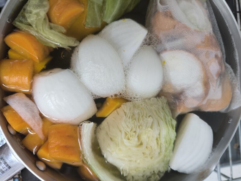 このスープは食材循環の仕組みにもなっています。スープを取った後の野菜は、カレーや煮物に展開して冷凍ストックへ。無駄を出さず、栄養と段取りを同時に回す仕組みです。